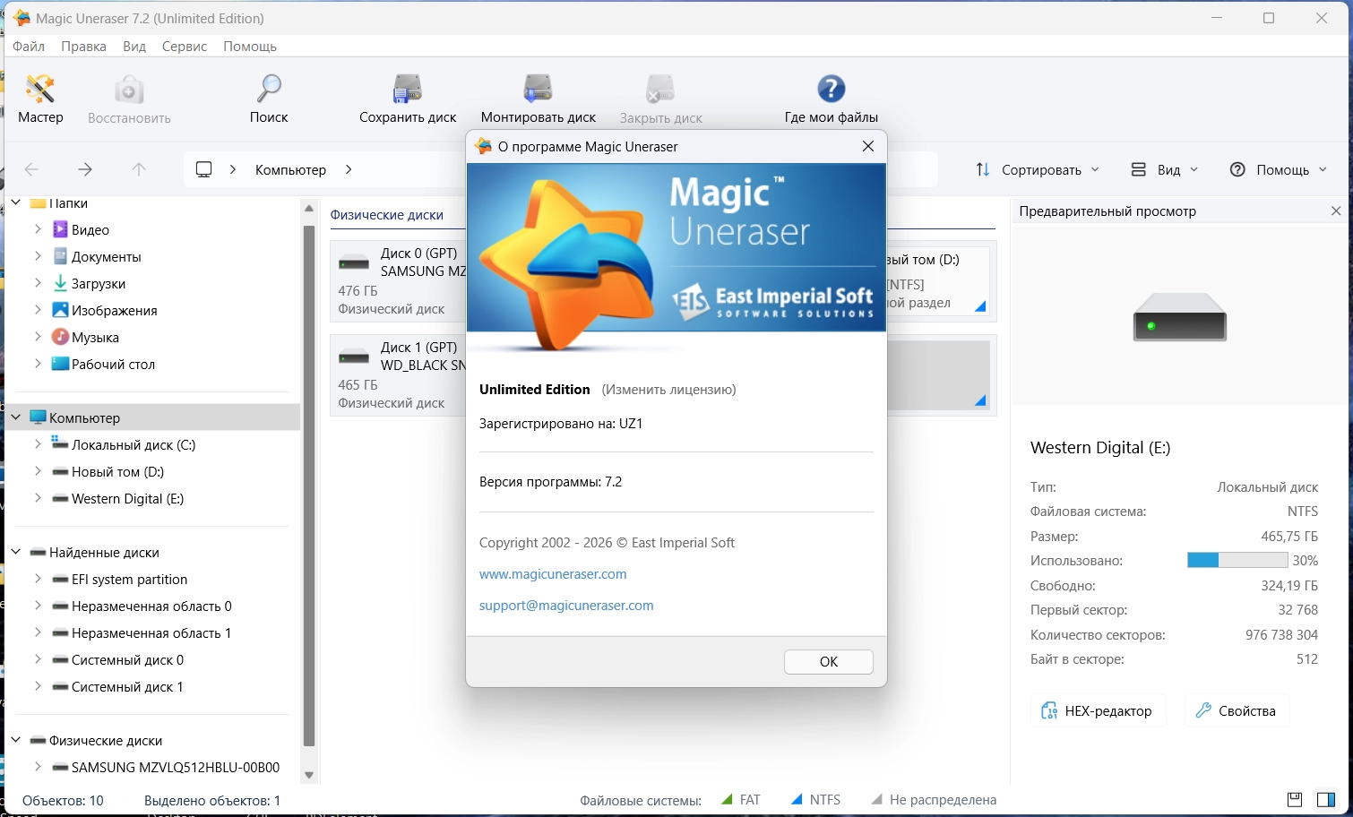 Magic Uneraser от East Imperial Soft предлагает восстановление файлов всех типов, включая документы, фотографии, mp3 и ZIP файлы. Эти файлы могли быть утеряны при очищении корзины, удалении через командную строку, после форматирования или при удалении без использования корзины. В дополнение к жёстким дискам, программа для восстановления файлов поддерживает любые типы носителей информации (USB-диски, mp3-плейеры, цифровые камеры, фотоаппараты, флэш-карты, карты памяти мобильных телефонов и т.д.). А встроенный предварительный просмотр позволяет просмотреть файл перед его восстановлением. Magic Uneraser тщательно сканирует нужный диск, находит удалённые файлы и правильно восстанавливает их. Также продукт восстанавливает файлы с удалённых и отформатированных дисков. Вы можете использовать программу для восстановления файлов с испорченных дискет. Для безопасного восстановления удаленных файлов в программе реализована возможность создания и использования образа диска. Поддерживается создание образа, как логического тома, так и всего жесткого диска.