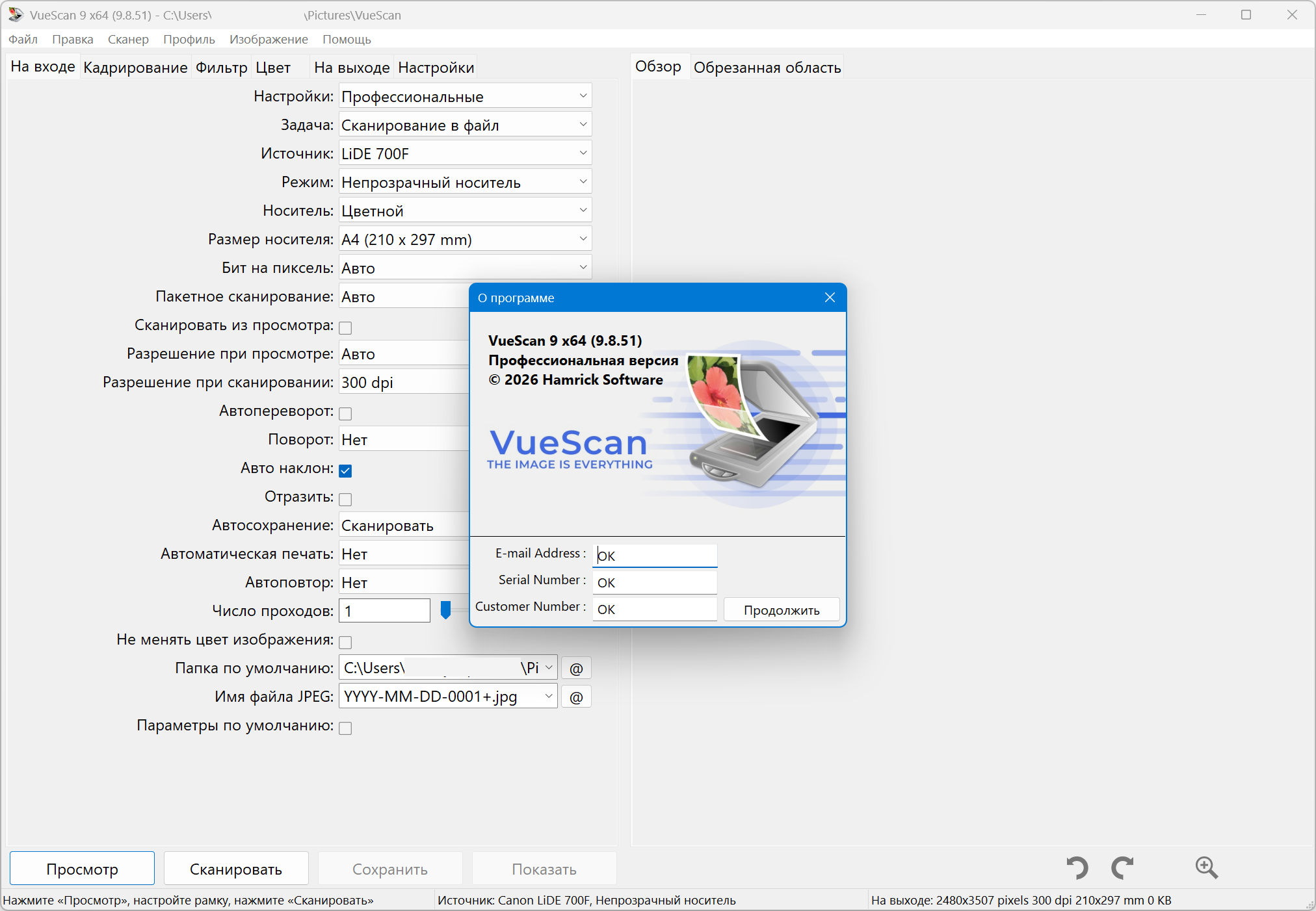 4. Запустить VueScan и ввести в окно регистрации данные из VueScan KeyGen