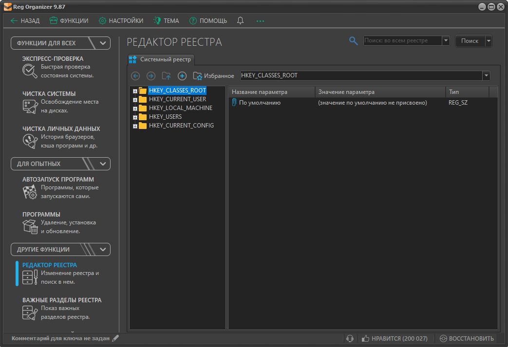 • Продвинутый редактор реестра Reg Organizer позволяет производить различные операции с системным реестром, в том числе экспортировать, импортировать, копировать значения ключей и многое другое. В отличие от встроенного в Windows, редактор реестра в Reg Organizer более функционален.