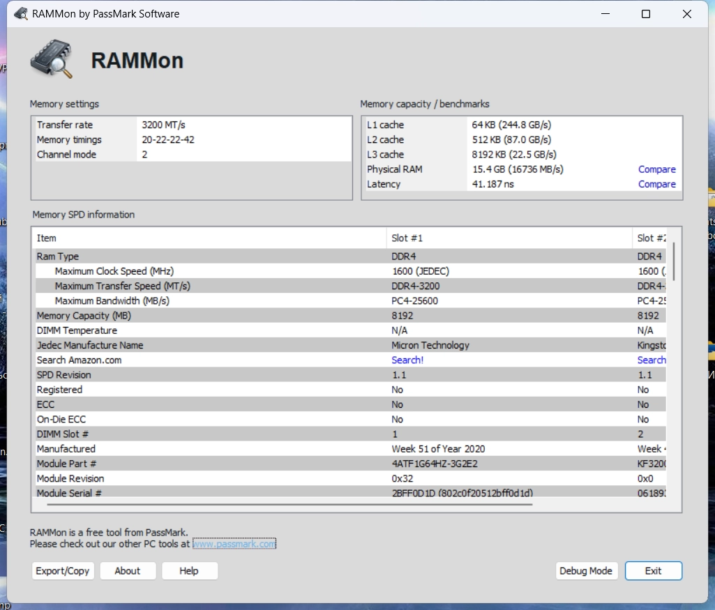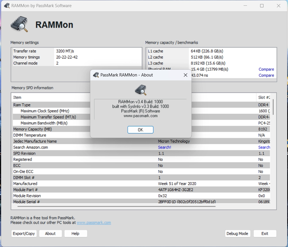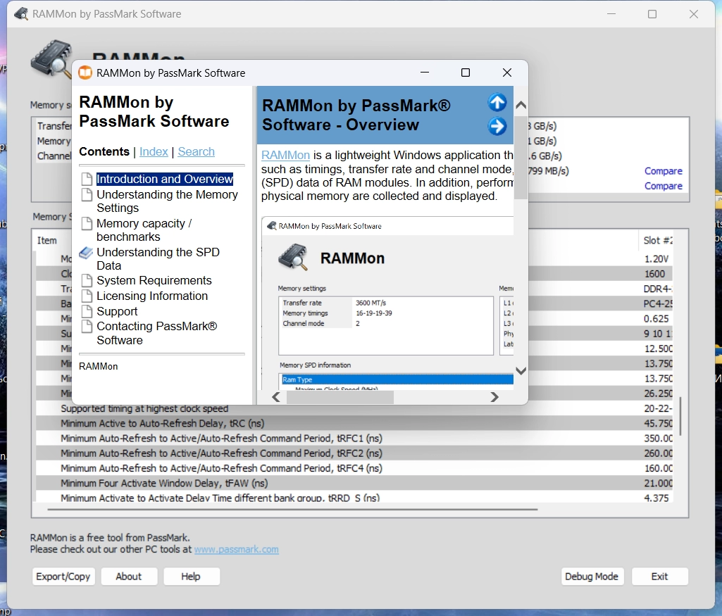 PassMark RAMMon - удобная и полезная утилита для получения и отображения информации SPD (Serial Presence Detect) из установленных на ПК модулей оперативной памяти. Эта информация представляет собой срез имеющихся данных для каждого модуля оперативной памяти, установленной в системе. Отображаются такие атрибуты как производитель, тактовая частота, серийный номер, объем памяти, рабочая температура, размер и др. данные. Поддерживаются различные типы оперативной памяти - DDR2, DDR3, DDR4, DDR5, XMP и EPP и даже некоторые более старые типы памяти.