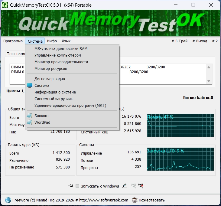QuickMemoryTestOK - небольшая, но эффективная утилита для быстрой проверки оперативной памяти на наличие ошибок.