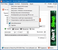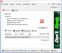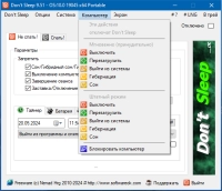 Dont Sleep - утилита, которая временно может отключить настройки электропитания. Можно выбрать, что именно отключать - хранитель экрана, режим гибернации, блокировку рабочего стола. Также программа позволяет отсчитывать время, которое предоставляется компьютеру для работы без настроек питания, а после сможет выключить, заблокировать компьютер или отправить его в режим сна.