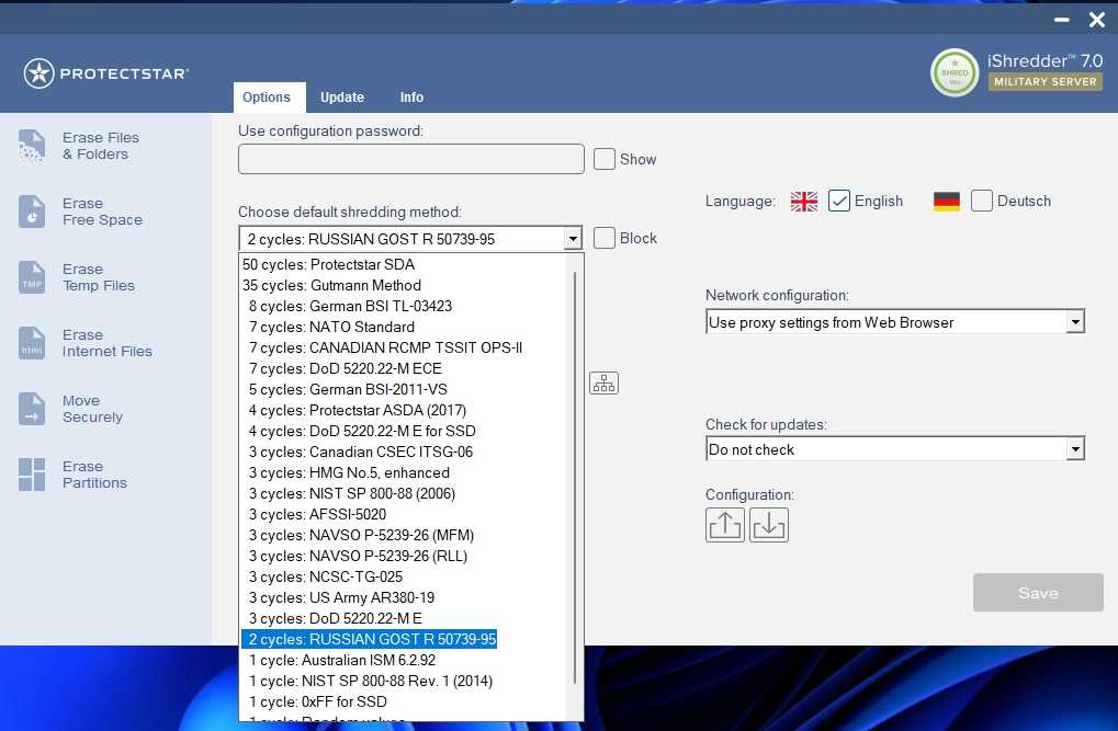 • iShredder™ Windows Server соответствует и превосходит государственные, военные и отраслевые стандарты по безвозвратному стиранию цифровой информации. Программное обеспечение стирает все существующие данные, включая конфиденциальные, секретные и сверхсекретные данные уровня безопасности, например, согласно немецкому стандарту BSI-VS-2011 (TL-03423) армии США AR380-19, DoD 5220.22-M E. и CSEC ITSG-06. Серверные версии предлагают до двадцать три безопасных методов удаления, сертифицированных государственными и военными организациями только для одной цели: безопасного удаления личных данных.