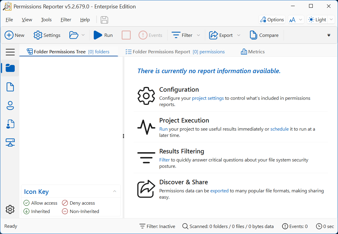 • Вам необходим визуальный интерактивный программный инструмент для управления правами доступа к файловой системе. Вам нужен Permissions Reporter — лучшее сетевое программное обеспечение для создания отчетов о правах доступа к файловой системе NTFS для Windows. Используйте его для проверки безопасности вашей файловой системы и быстрого и эффективного применения лучших практик . Все это с поддержкой множества форматов экспорта, командной строки, встроенным планированием, расширенной фильтрацией и многим другим.