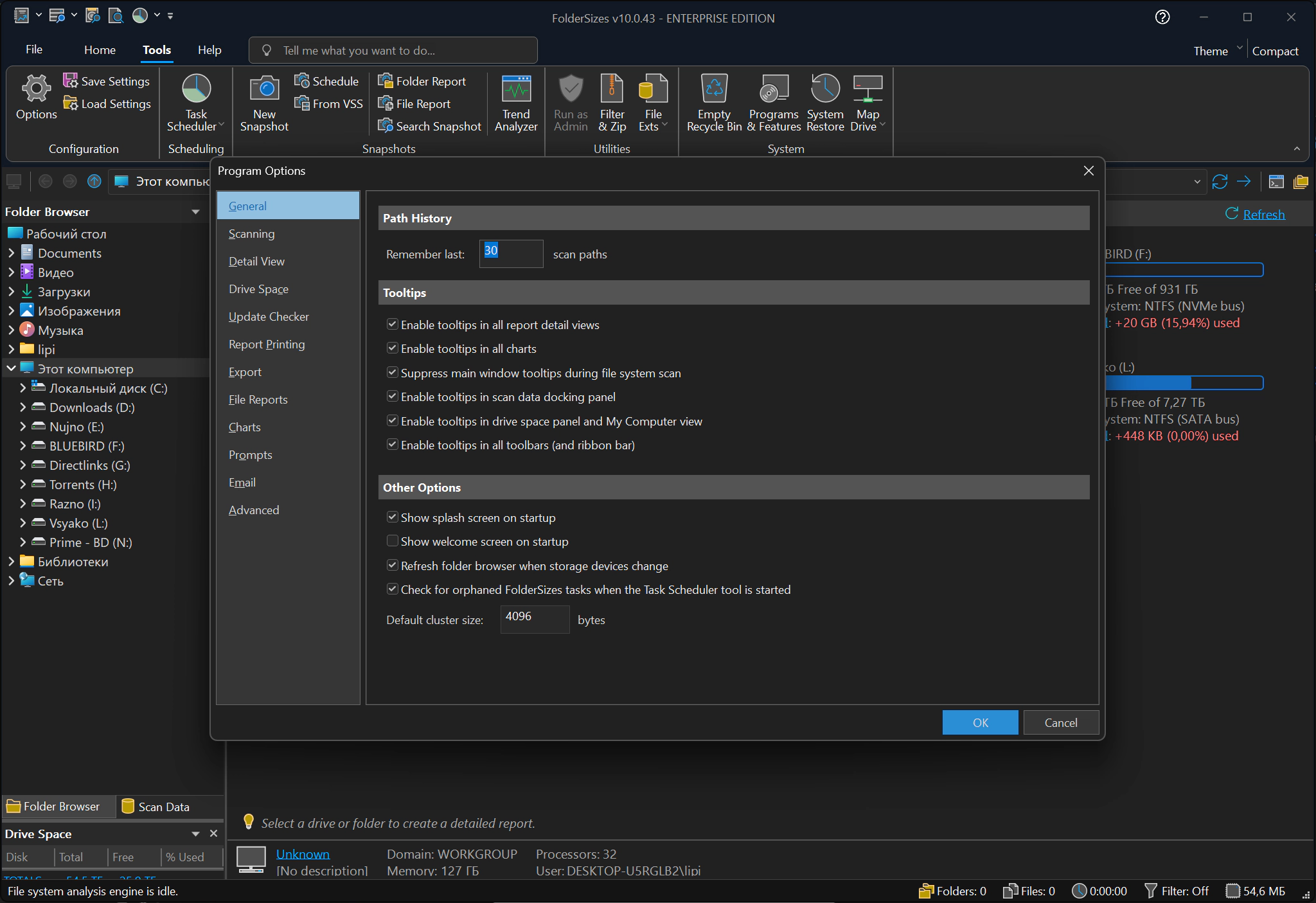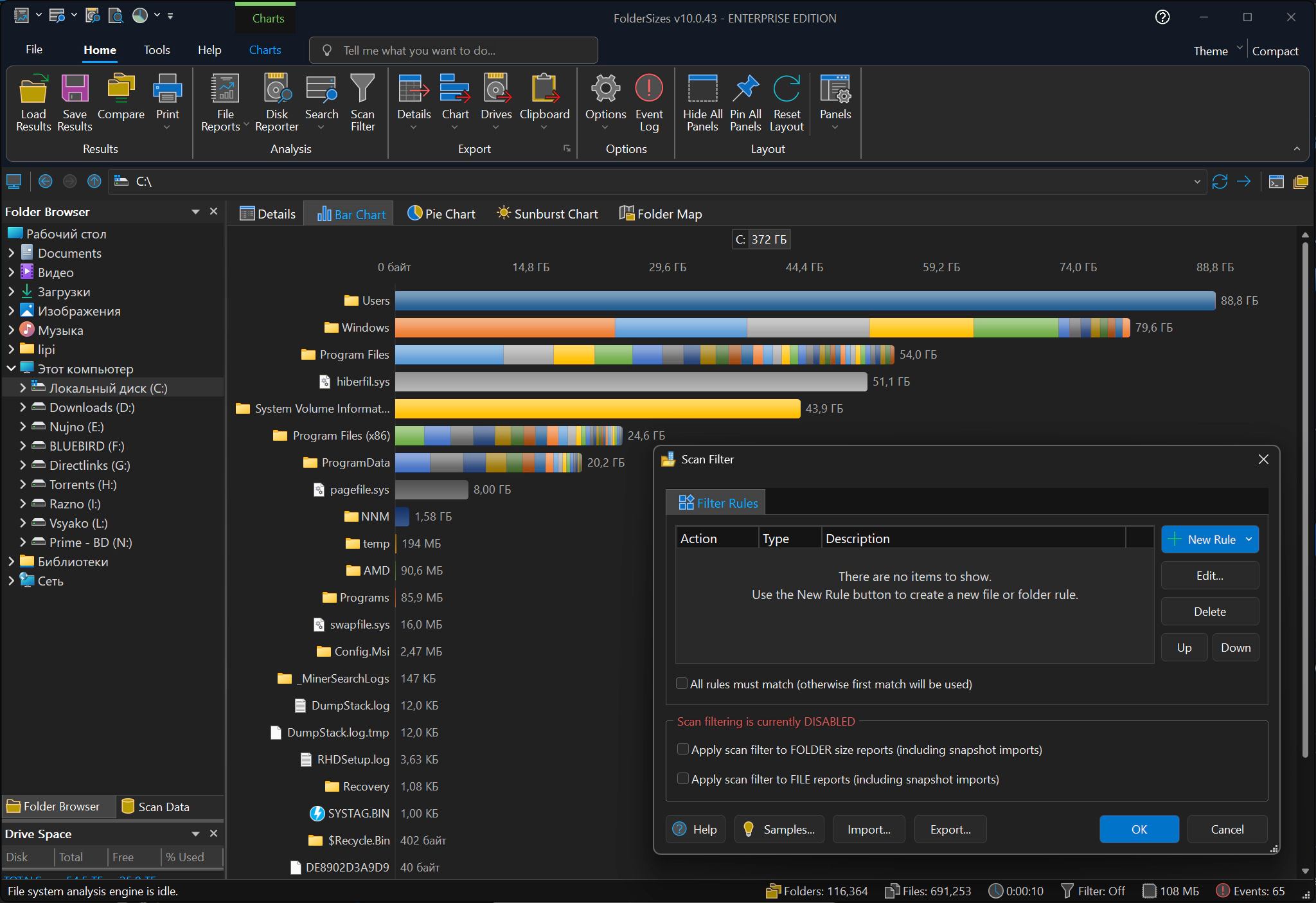 Размер файлов и папок FolderSizes Enterprise 10.0.43