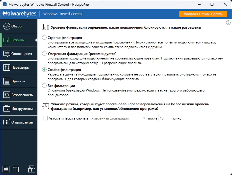 • Режим Обучения, который обеспечивает уведомления о заблокированных исходящих соединениях.