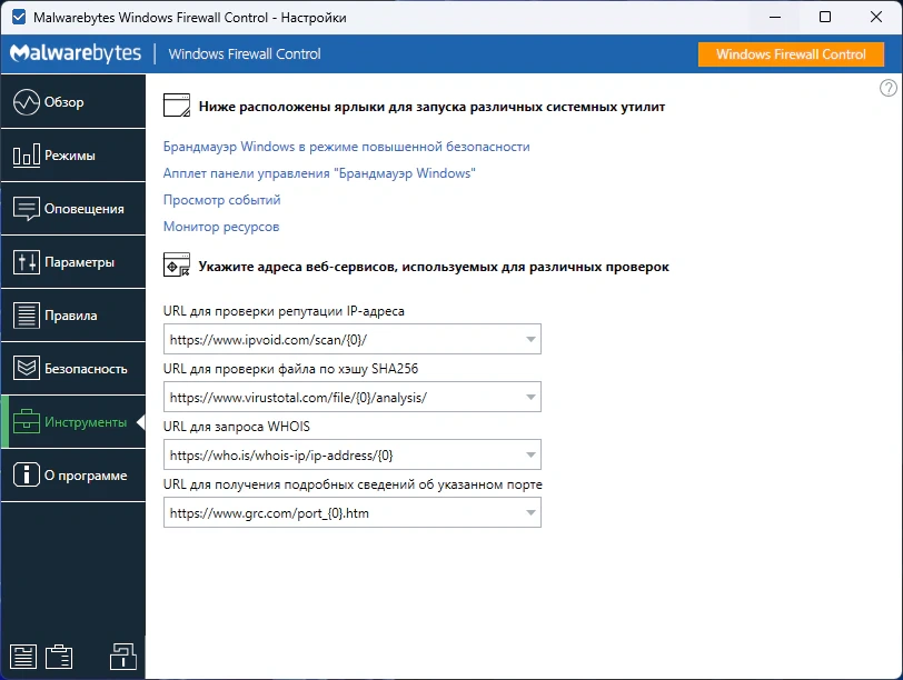• Быстрый доступ к редактированию правил Брандмауэра Windows непосредственно из интерфейса программы.