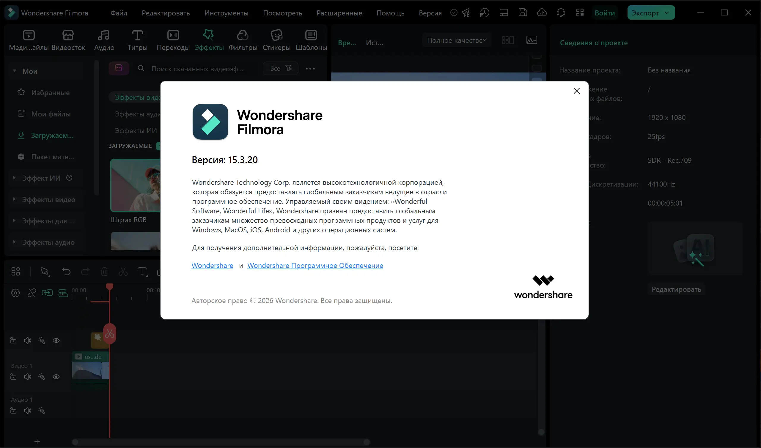 Конвертер SD и HD видео Wondershare Filmora 15.3.20.18660