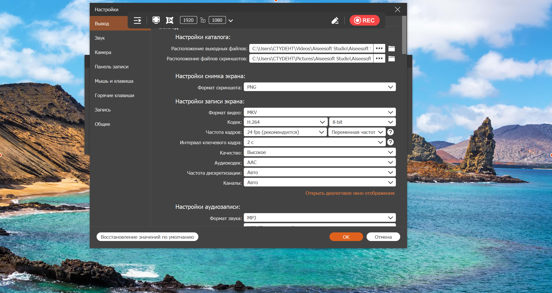 Больше настроек: Установите более индивидуальные способы записи экрана, горячие клавиши и другие параметры вывода. Установите видеокодек, качество, частоту кадров, качество звука и многое другое.