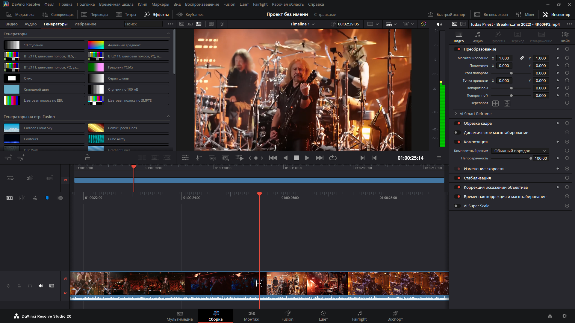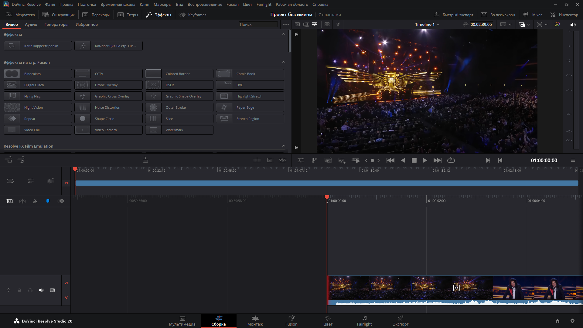 DaVinci Resolve Studio содержит свыше 100 плагинов Resolve FX с GPU- и CPU-ускорением, предназначенных для добавления размытия и световых изменений, артефактов и стилизации, реставрации изображения и улучшения внешности. В последней версии приложения появилось 11 дополнительных модулей, позволяющих усиливать текстуру, восстанавливать детали, выполнять 3D-, HSL- и яркостный кеинг, преобразование видео и шумоподавление. С их помощью можно также создавать шлейфы движения и смазанность, условный цвет и коллажи, которые превосходно подходят для режима «картинка в картинке» и трансляции выступлений виртуальных хоров. Кроме того, оптимизированы функции удаления объектов и пыли, устранения битых пикселей и имитации зернистости пленки. Для анимирования эффектов Resolve FX теперь служит новый унифицированный «Инспектор» на страницах «Сборка», «Монтаж» и Fusion.