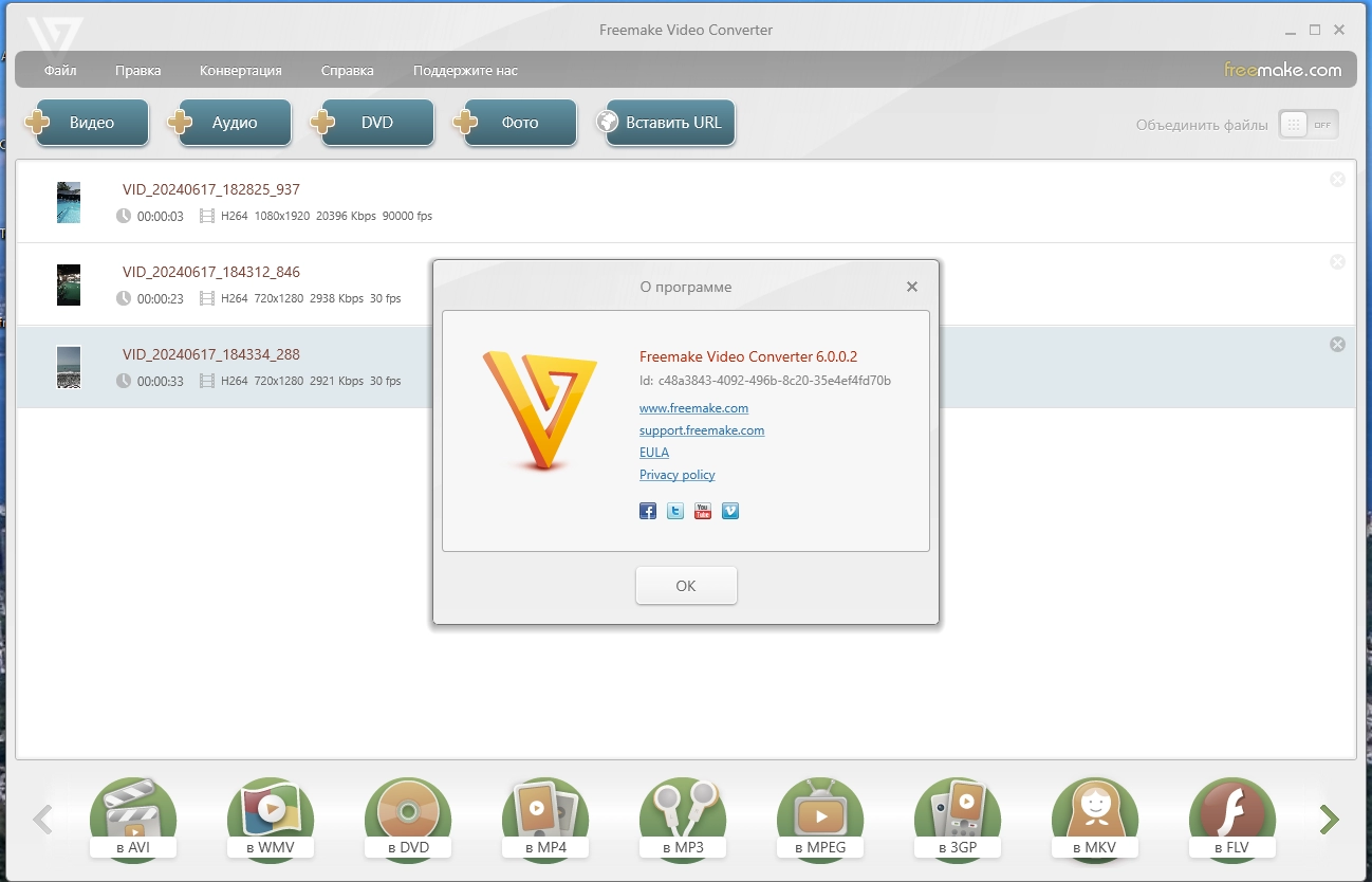 Freemake Video Converter конвертирует видео в таких форматах, как MP4, AVI, MKV, WMV, MP3, DVD, 3GP, SWF, FLV, HD, MOV, RM,QT, Divx, Xvid, TS, Fraps и др. Поддерживаются все современные кодеки: H.264, MKV, MPEG4, AAC. Создавайте видео из аудио и фото. Конвертируйте много файлов одновременно.