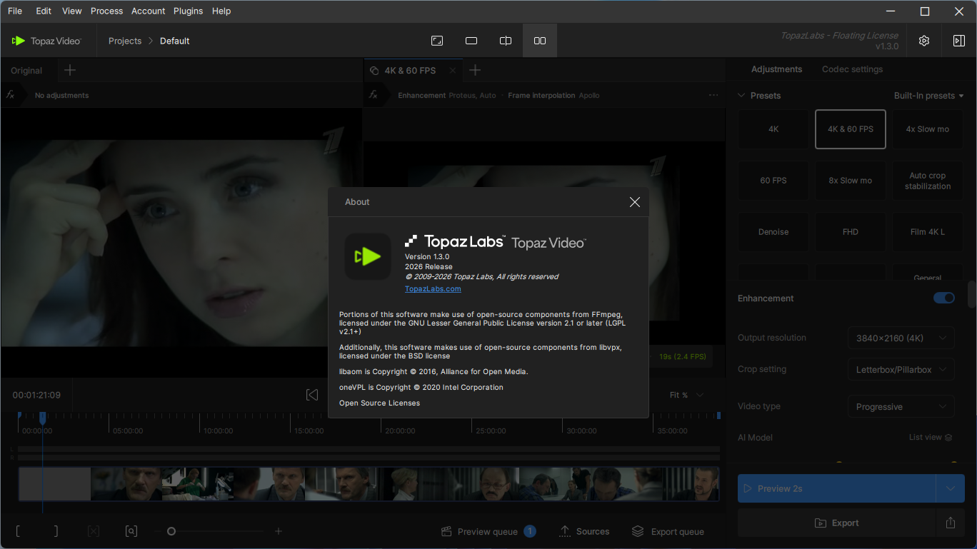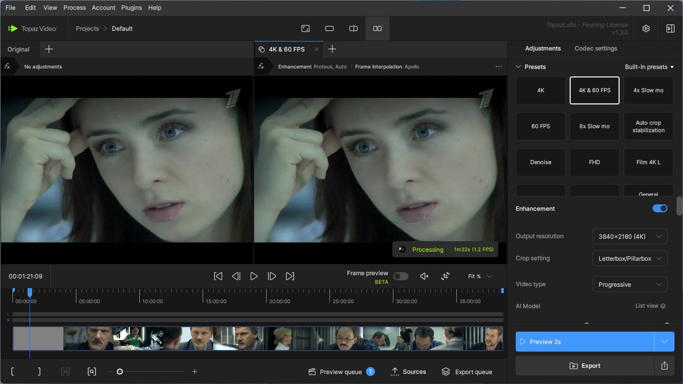 Topaz Video – это совершенное новое решение для увеличения видео, с использованием искусственного интеллекта. Обученный работе с тысячами видео и сочетающий в себе информацию из нескольких входных видеокадров, увеличит ваше видео до разрешения 8K с точными деталями и последовательностью движения. До сих пор не было возможности идеально воссоздать видео высокого разрешения из видеоряда низкого разрешения. Превратит ваши видео в чистые увеличенные кадры с разрешением до 8K, от старых домашних фильмов до низкокачественных SD и DVD.