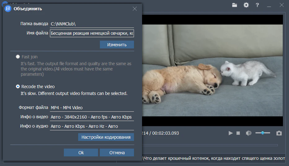 • Объединенное видео может быть в любом видеоформате.
