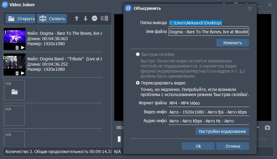 • Объединенное видео может быть в любом видеоформате.