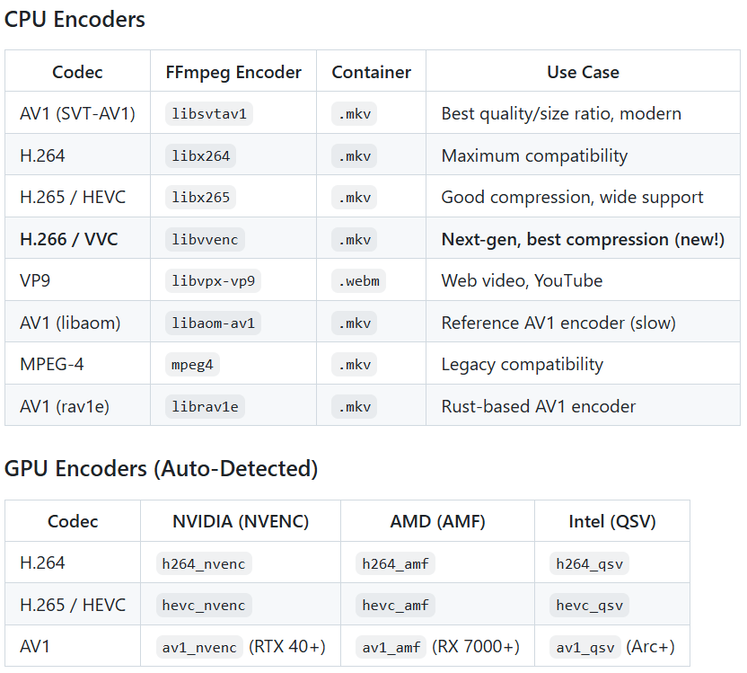• 8 видеокодеков — AV1 (SVT-AV1), H.264, H.265/HEVC, H.266/VVC, VP9, AV1 (libaom), MPEG-4, AV1 (rav1e)