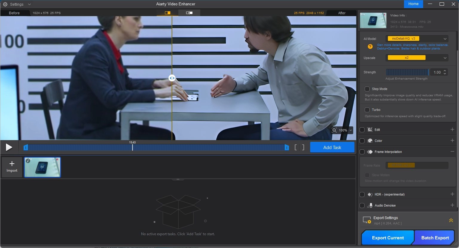 • Улучшение до 4K с сохранением деталей. Специальные ИИ-модели преобразуют видео низкого качества, с заиканиями или шумами в четкое и плавное 4K-видео. Наслаждайтесь кинематографическим качеством и погружающим визуальным рядом.