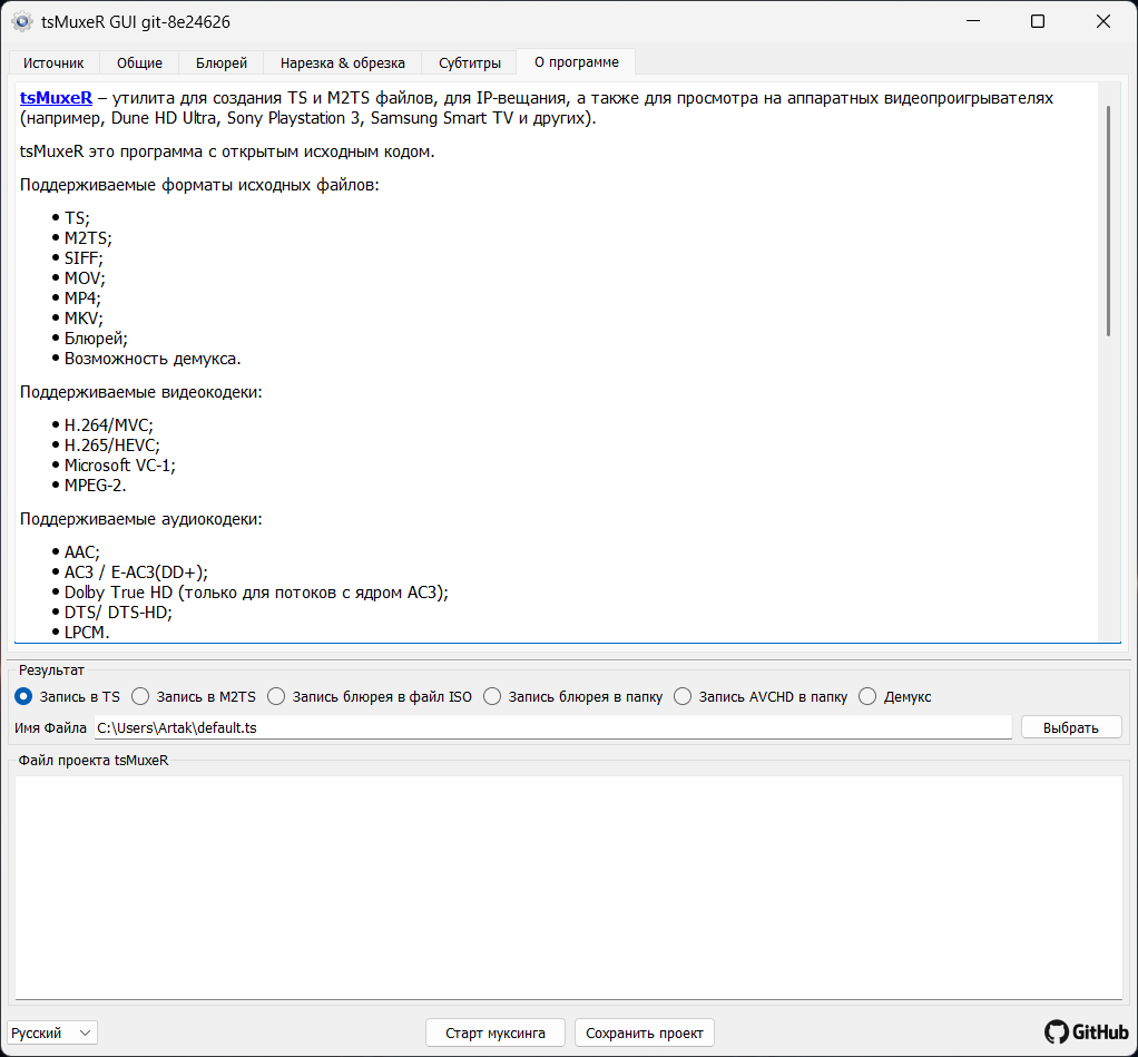 tsMuxer — это мультиплексор транспортных потоков, предназначенный для ремультиплексирования/мультиплексирования элементарных потоков, файлов форматов EVO/VOB/MPG, MKV/MKA, MP4/MOV, TS, M2TS в TS и M2TS. Поддерживаемые видеокодеки: H.264/AVC, H.265/HEVC, VC-1, MPEG2. Поддерживаемые аудиокодеки: AAC, AC3 / E-AC3(DD+), DTS/ DTS-HD.