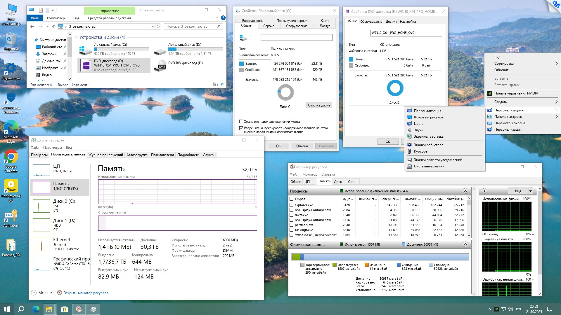 Добавлено: запущен компонент ОС .NetFramework 3.5 (2.0 и 3.0 включительно), требуется некоторым программам, запущен протокол SMB1 для старых сетей, отображать "Мой Компьютер" на рабочем столе, в меню рабочего стола добавлены дополнительное подменю "Персонализация+"