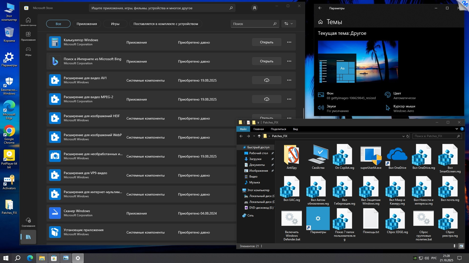 - На рабочий стол добавлена папка Patches_FIX с патчами системы, твики для включения защитника Windows, SmartScreen, UAC, гибернации, телеметрии, "Новости и Интересы", микрофон и камера, автоматического обновления, показ 7 пользовательских папок в окне Компьютер, OneDrive и др. В папке "AntiSpy" находится антишпионская программа ShutUp10.