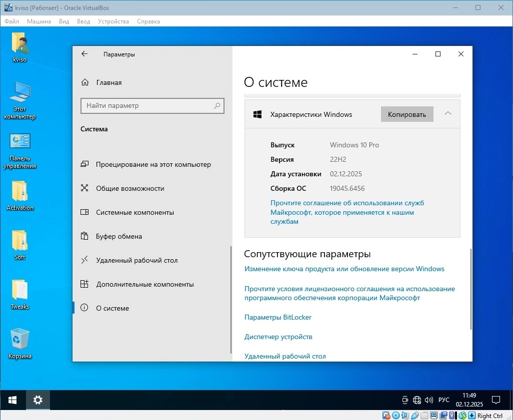 Сборка Windows 10 Pro сделана на основе оригинального образа от MSDN: 22H2 (build 19045.6456). Установлен NET Framework 3.5 (включает .NET 2.0 и 3.0); включен стандартный просмотр фото; применены необходимые настройки. Для получения полной информаций об изменениях, читайте раздел "дополнительная информация".