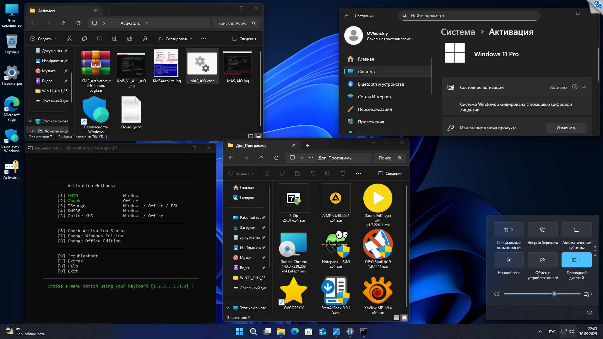 Если активация не удалась с первого раза, повторите попытку после перезагрузки любым другим активатором, присутствующих в папке. Запустите расписание для автоматической переактивации чтобы не беспокоиться об активации в дальнейшем. Обязательно отключите антивирус или защитник Windows при активации и внесите активаторы в разряд доверенных. Читайте файл помощи в папке с активаторами. Для более подробной информации в папке с активаторами присутствует файл помощи и картинки с инструкциями.
