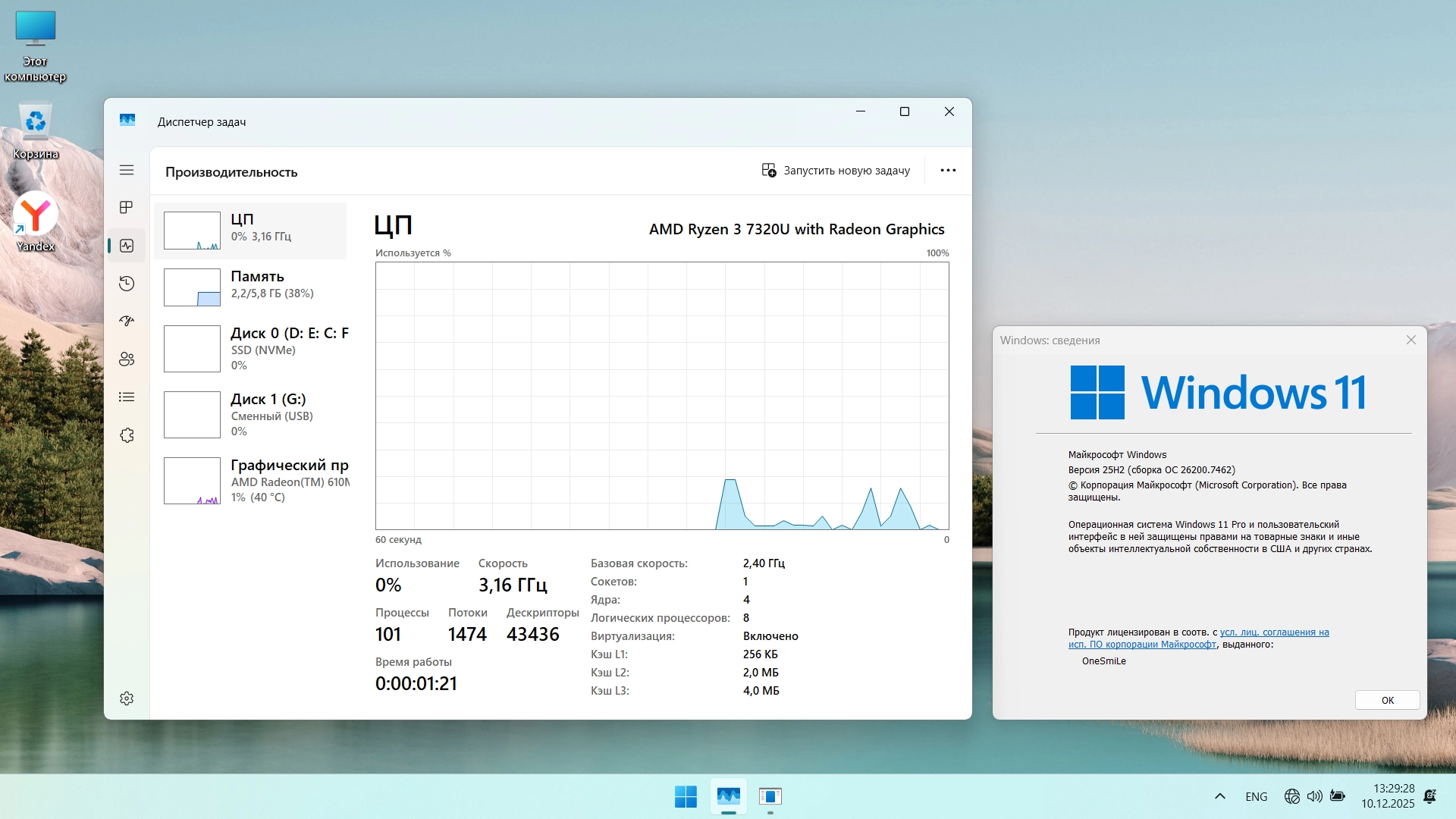 Сборка сделана из оригинальных образов Windows 11 25H2 с обновлениями по 09.12.2025. Удалены все модерн приложения, отключена телеметрия и защитник. Полуавтоматическая установка с выбором имени пользователя и раздела.