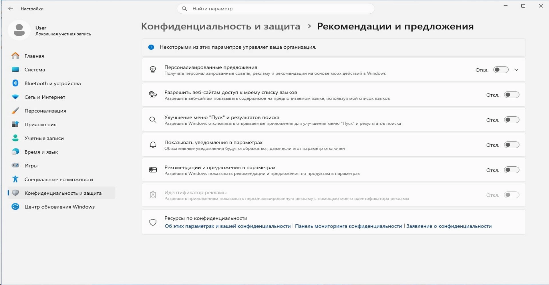 • Все навязчивые, рекламные предложения, уведомления и подсказки в меню Пуск и т.п.