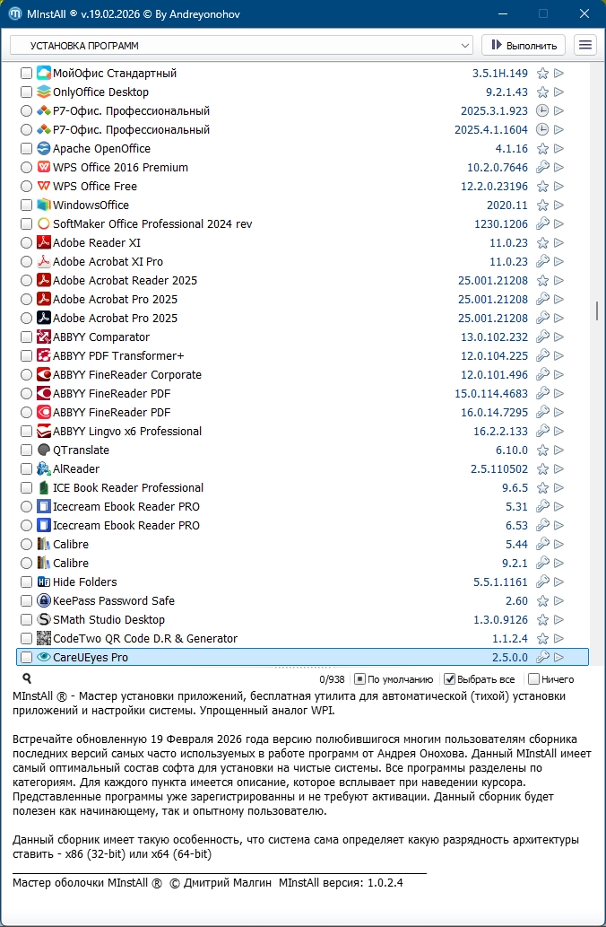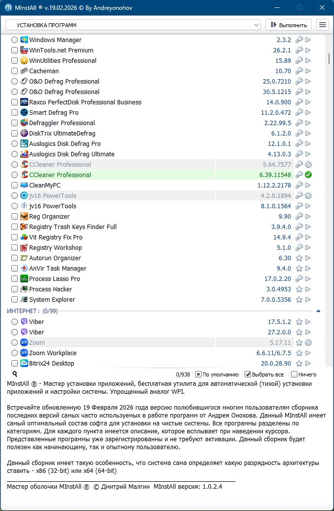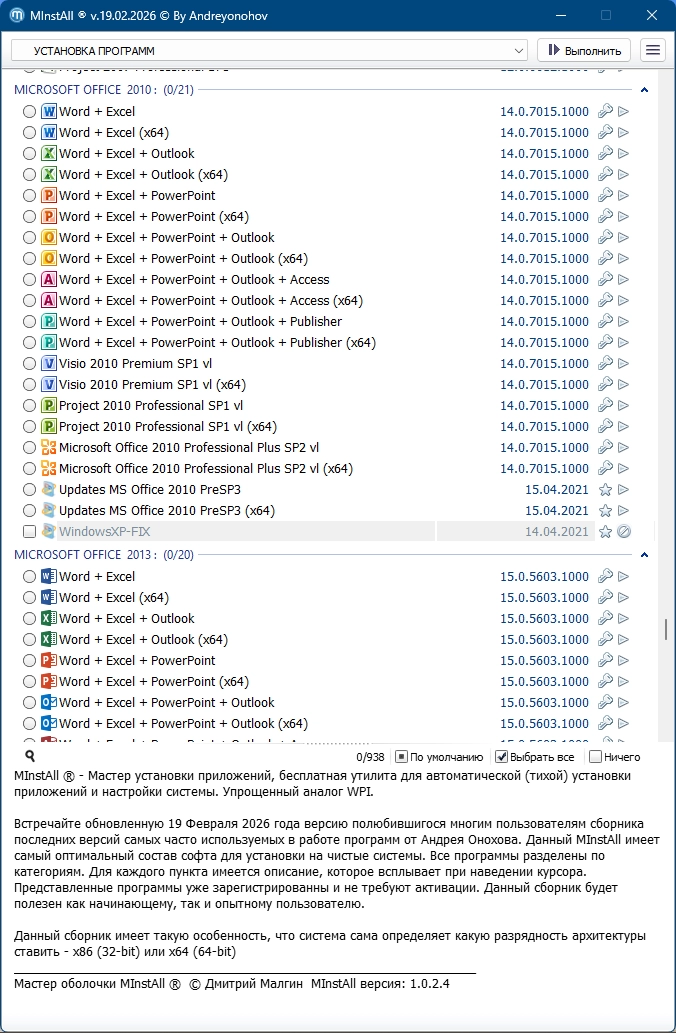 Перед Вами обновленный 19 Февраля 2026 года полюбившийся многим пользователям сборник последних версий самых часто используемых в работе программ от Андрея Онохова. Теперь в новой, более простой и удобной оболочке MInstAll - это новый мастер установки приложений, упрощенный аналог WPI. Данный MInstAll имеет самый оптимальный состав софта для установки на чистые системы. Представленные программы уже зарегистрированы и не требуют активации.