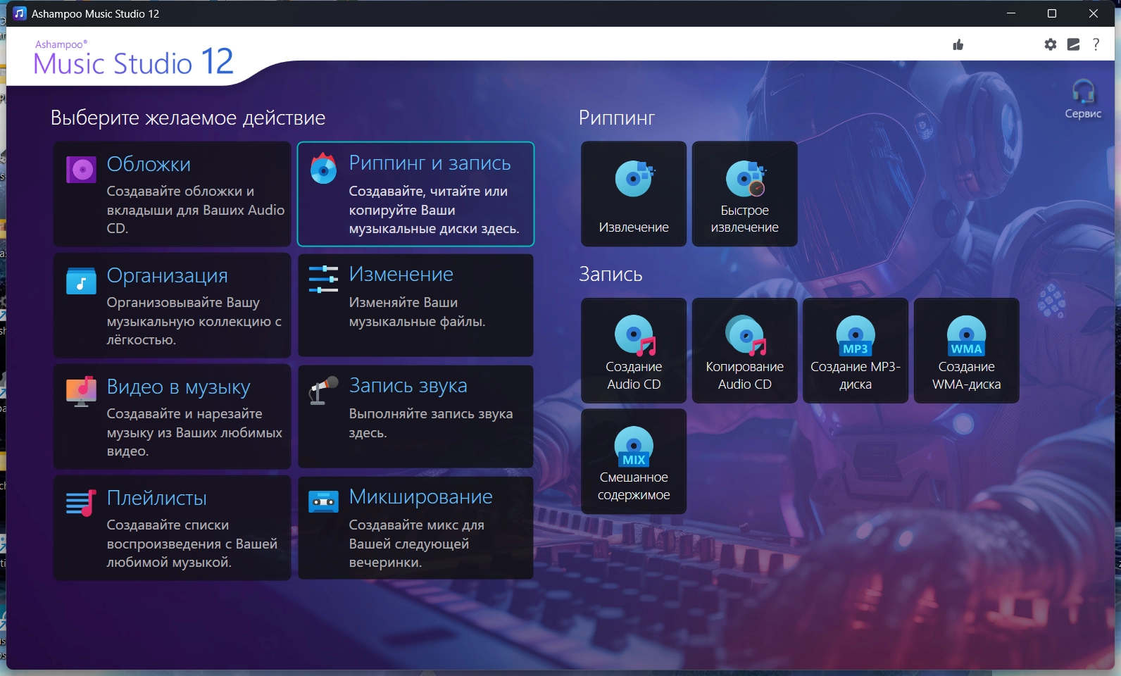 • Благодаря мощным функциям Ashampoo Music Studio 12 ты получишь всё самое лучшее от своей музыкальной коллекции! Восемь удобных модулей охватывают практически всё, что нужно любителям музыки на компьютере. Хочешь ли ты отредактировать, записать или нарезать свои любимые песни – с Ashampoo Music Studio 12 ты сможешь сделать это быстро и легко. Записывай музыку из Spotify, Deezer, Amazon Music и многих других! Конвертируй в другие совместимые форматы, создавай сборники для следующей вечеринки или плейлисты для любого аудиоустройства! Наведи порядок в своей музыкальной коллекции, печатай обложки, копируй компакт-диски и многое другое!