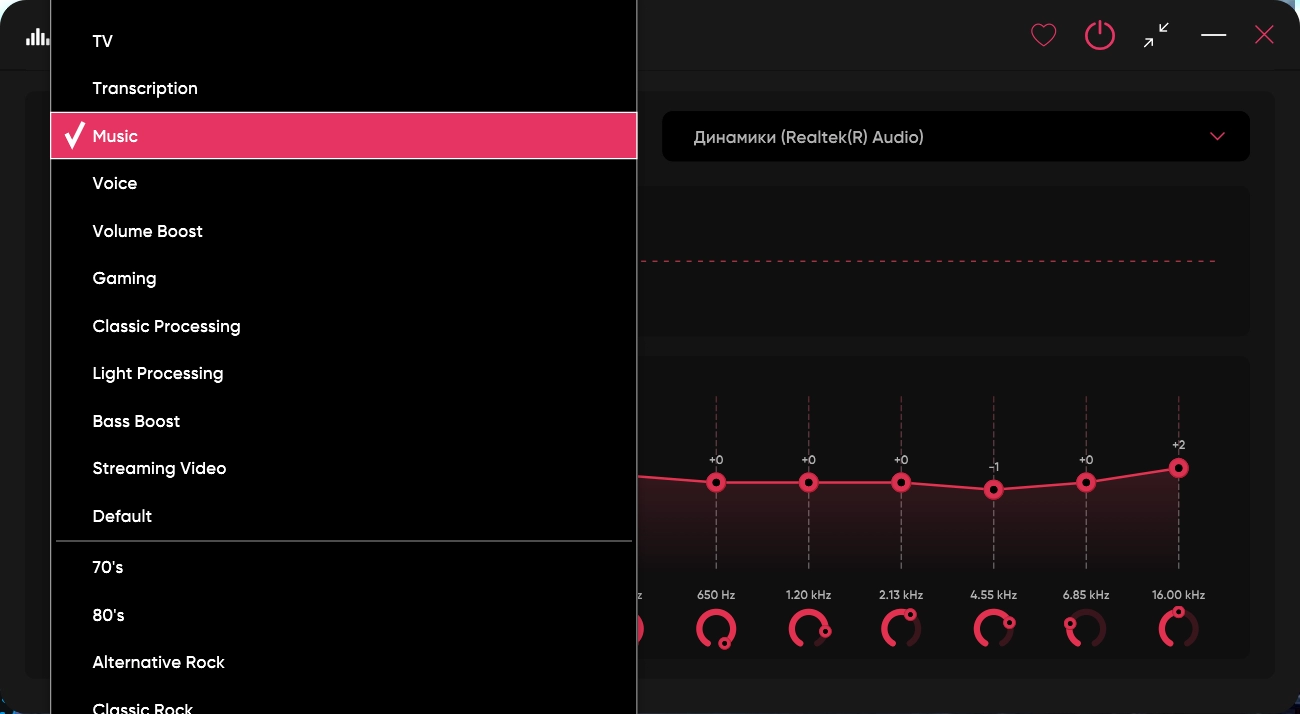 Приложение предлагает эквалайзер, анализатор спектра, присутствует режим глубокого звука и супербаса, имеются встроенные пресеты (Музыка, Игры, Стриминговое видео и пр.) и многое другое.