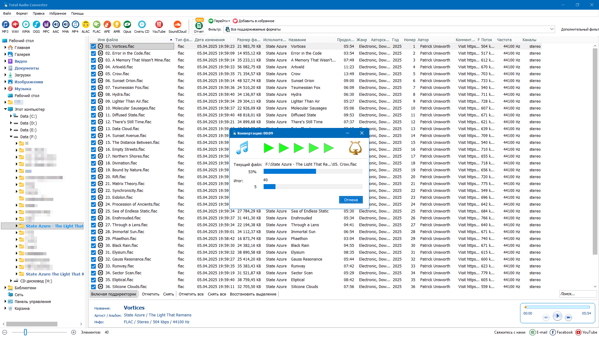 Total Audio Converter - мощный конвертор всех музыкальных форматов файлов и возможностью CD-риппинга. Программа поддерживает теги ID3 и CUE файлы, преобразовывает аудиотреки без создания промежуточного WAV файла, работает в пакетном режиме, имеет высокую скорость работы, по завершении процесса позволяет проиграть файл, а наличие понятного русскоязычного двухпанельного интерфейса с окном помощника, обеспечивают простоту и увлекательность процесса.